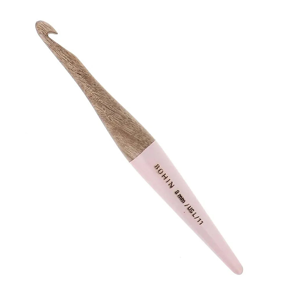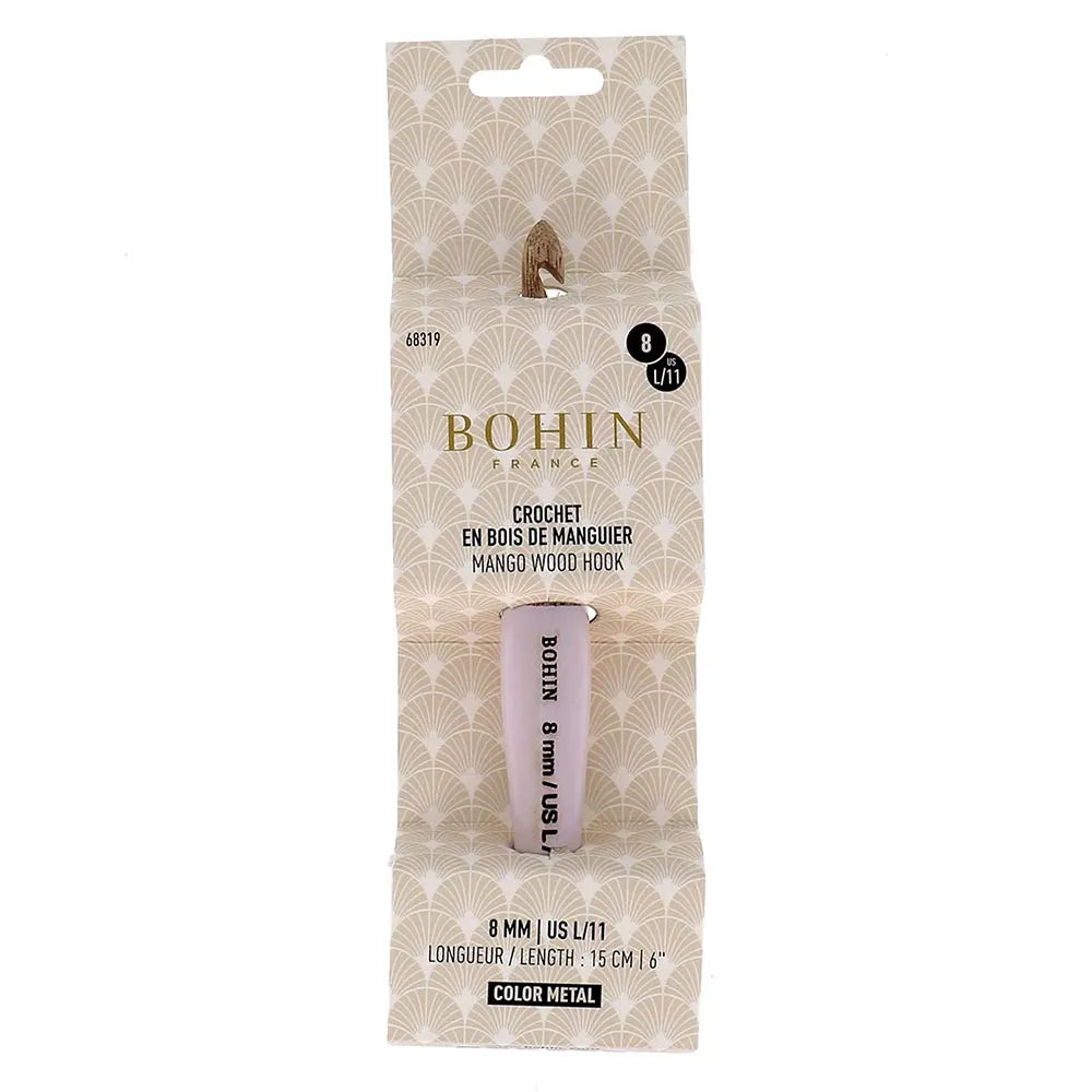 De prachtige haaknaalden van Bohin vallen op door hun bijzondere ontwerp en zorgen voor een comfortabele haak-ervaring. De naalden zijn gemaakt van mangohout, wat heerlijk warm aanvoelt in je handen. De haaknaalden zijn licht van gewicht en flexibel en hebben een ergonomisch ontwerp, waardoor je geen last zult krijgen van vermoeide handen. Door de gladde afwerking en de perfect gevormde punt steek je makkelijk in en glijdt de naald moeiteloos door de steken. De bovenste helft van de naalden heeft de natuurlijke houtkleur, de onderste helft is geverfd: elke naalddikte heeft zijn eigen kleur. De naalddikte is tevens duidelijk aangegeven op het gekleurde gedeelte. De haaknaald is 15cm lang en verkrijgbaar in naalddiktes 3.50, 4.00, 4.50, 5.00, 5.50, 6.00, 6.50, 7.00, 8.00, 9.00, 10.00, 12.00 en 15.00mm.