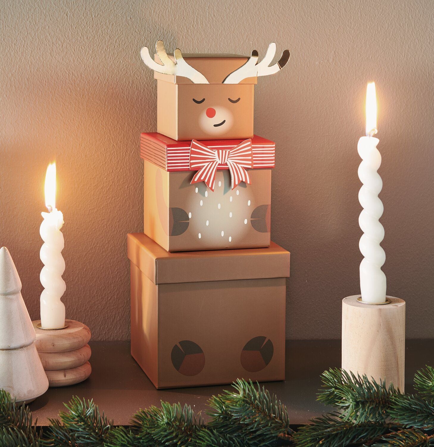 De geschenkdoosenset Rendier combineert een feestelijk ontwerp met duurzaamheid. De stapelbare dozen zijn aan beide zijden bedrukt en voorzien van een hoogwaardige Hot Foil-afwerking. Voor een bijzonder 3D-effect worden de gewei en strik apart meegeleverd en kunnen met behulp van de meegeleverde plakstrips worden bevestigd. Ideaal voor creatieve cadeauverpakkingen. Als de drie dozen in verschillende maten tot een piramide worden samengevoegd, ontstaat een schattig rendier.