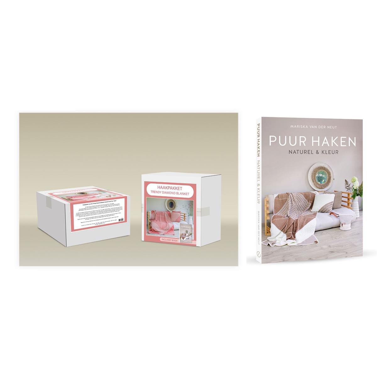 Het pakket bevat een uniek label voor de Trendy Diamond Blanket in het Rose, voldoende garen en het boek Puur Haken van Mariska, ook bekend als Handmadejolie.