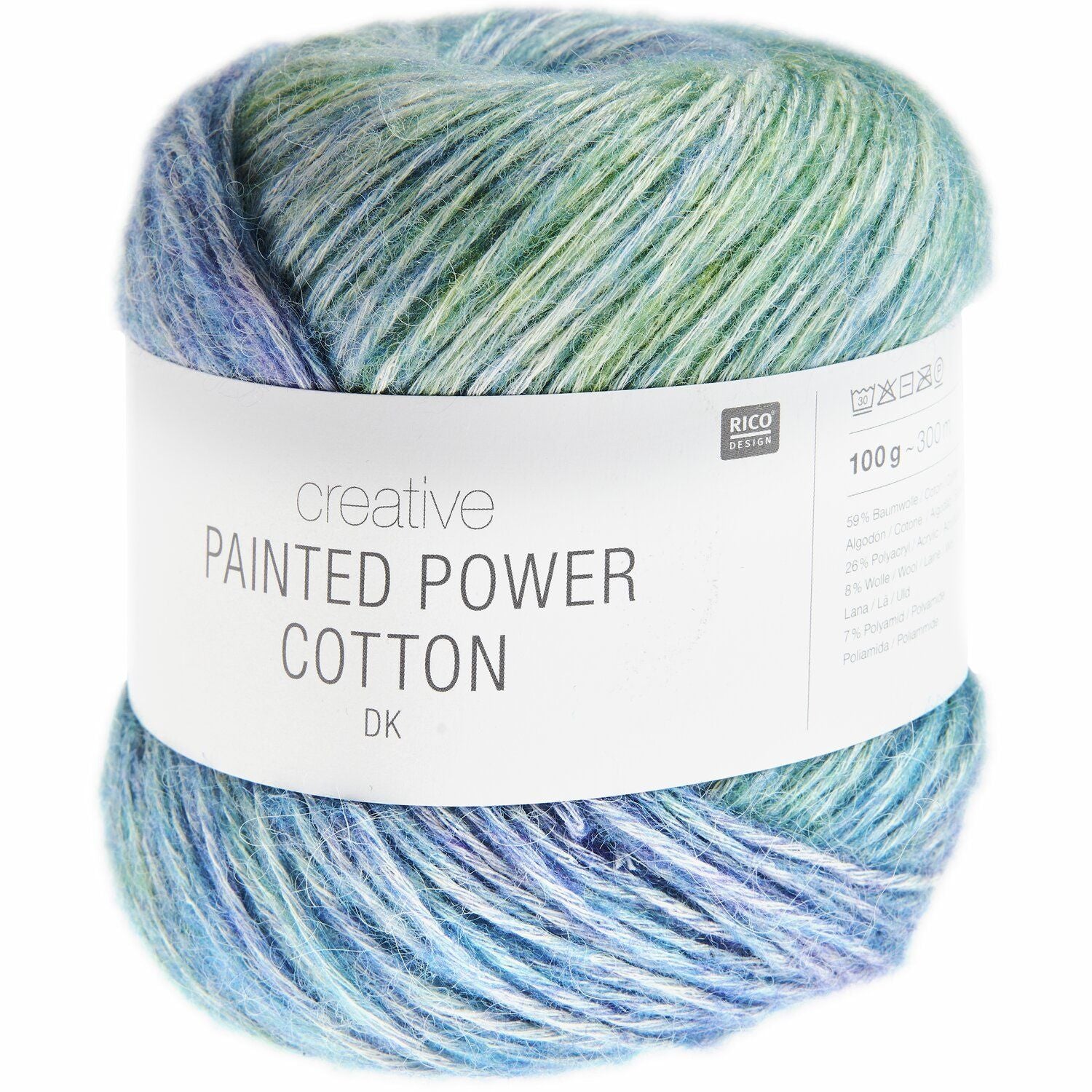 Creative Painted Power Cotton DK van Rico Design is een garen dat bestaat uit een mix van materialen: 59% katoen (CO), 26% polyacryl (PAN), 8% wol (WO), en 7% polyamide (PA). Dit garen heeft een gewicht van 100 gram en een looplengte van 300 meter, wat het geschikt maakt voor diverse haak- of breiprojecten.